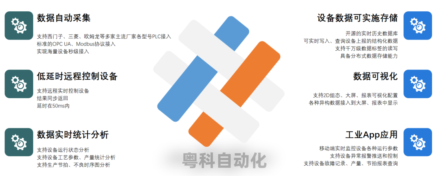 工业互联是企业实现智能制造的核心,也是建设智能工厂/数字化车间的前提和基础。粤科自动化通过与PLC、传感器、RFID、DCS、I/O、HMI 等多种自动化工业设备与系统联机,对车间的关键设备进行实时数据采集、监控、分析,实时掌握全局动态。