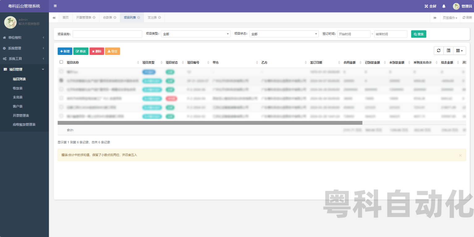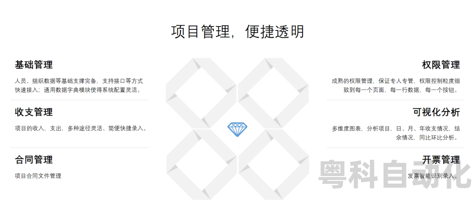 系统功能包括:基础信息管理、组织权限管理、数据分析管理、项目收支管理、项目合同管理、项目开票管理、客户维护管理。